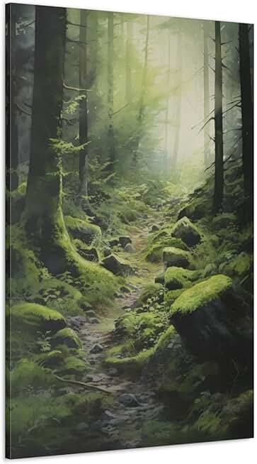 Mossy Forest Watercolor Painting Canvas Print | Dark Misty Forest Artwork | Peaceful Green Nature Art | Rustic Farmhouse Wall Decor 32″ x 48″