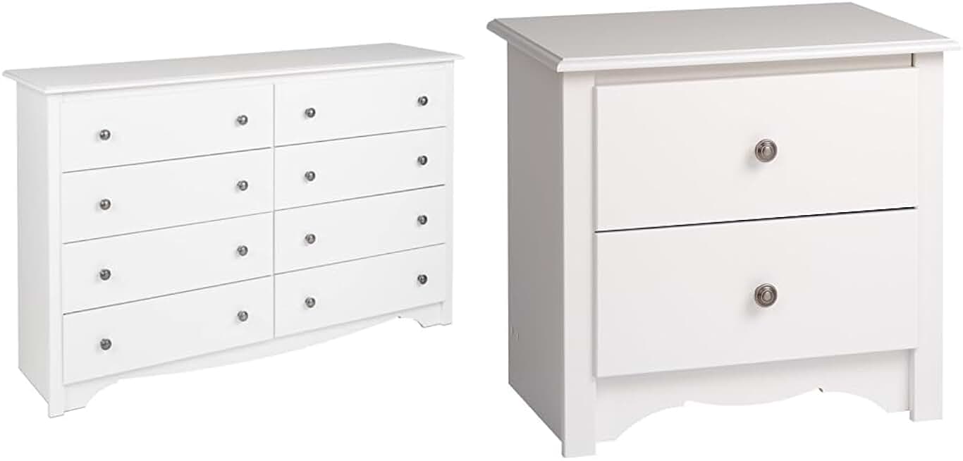 Prepac Monterey 8 Drawer Double Dresser for Bedroom, 15.75" D x 59" W x 36.25" H, White & 2-Drawer Nightstand, White