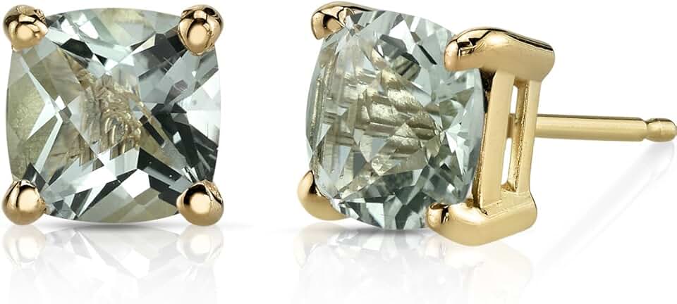 Peora Green Amethyst Stud Earrings for Women in 14 Karat Yellow Gold, Classic Solitaire, Cushion Cut 6mm, 1.75 Carats total, Friction Back