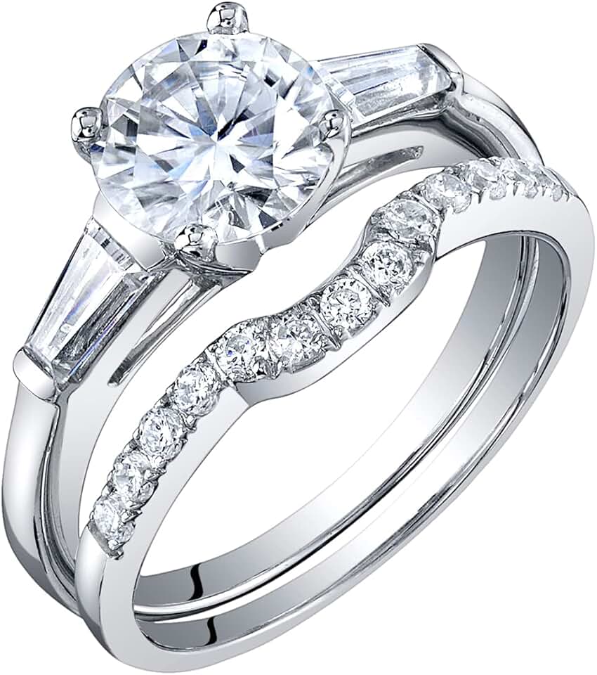 PEORA Moissanite Keepsake Solitaire Engagement Ring and Wedding Band Bridal Set in Sterling Silver, 1.50 Carat Center, DE Color, VVS Clarity, Sizes 4 to 10