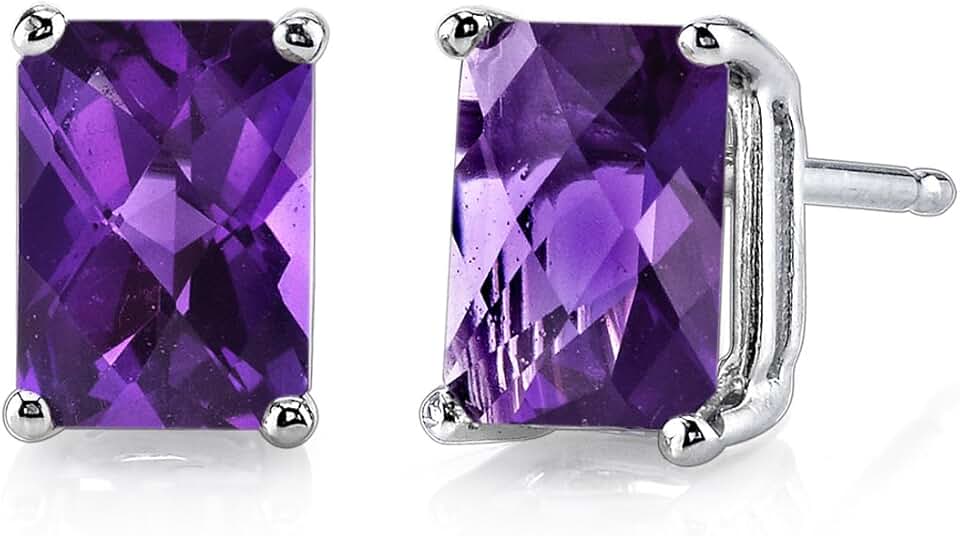 Peora Solid 14K White Gold Amethyst Earrings for Women, Genuine Gemstone Birthstone Solitaire Studs, 7x5mm Radiant Cut, 1.75 Carats total, Friction Back