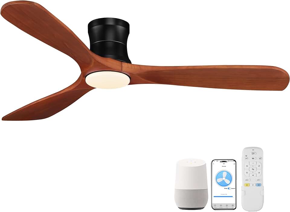 52” Smart Wood Low Profile Ceiling Fans with Lights Remote,Quiet DC Motor,Outdoor Indoor Flush Mount Ceiling Fan,Voice Control via WIFI Alexa App,Modern Dimmable Lighting Ceiling fan for Bedroom Patio