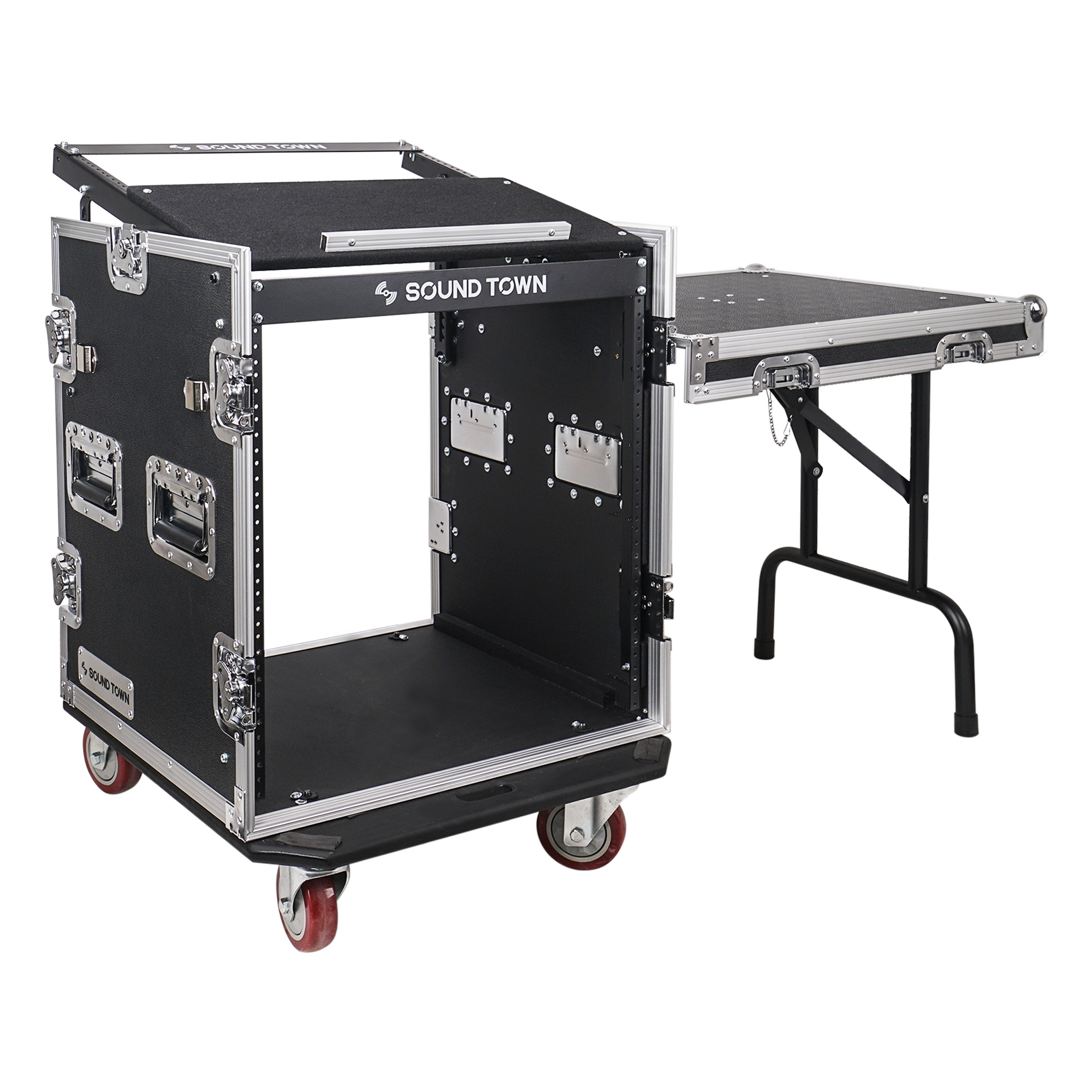 Sound Town Enhanced 1/2" (12mm) Plywood 12U PA DJ Rack/Road Case with 11U Slant Mixer Top, 20 Rackable Depth, DJ Work Table and Casters, 12-Space ATA Case, Pro Tour Grade (STMR-S12UWT)