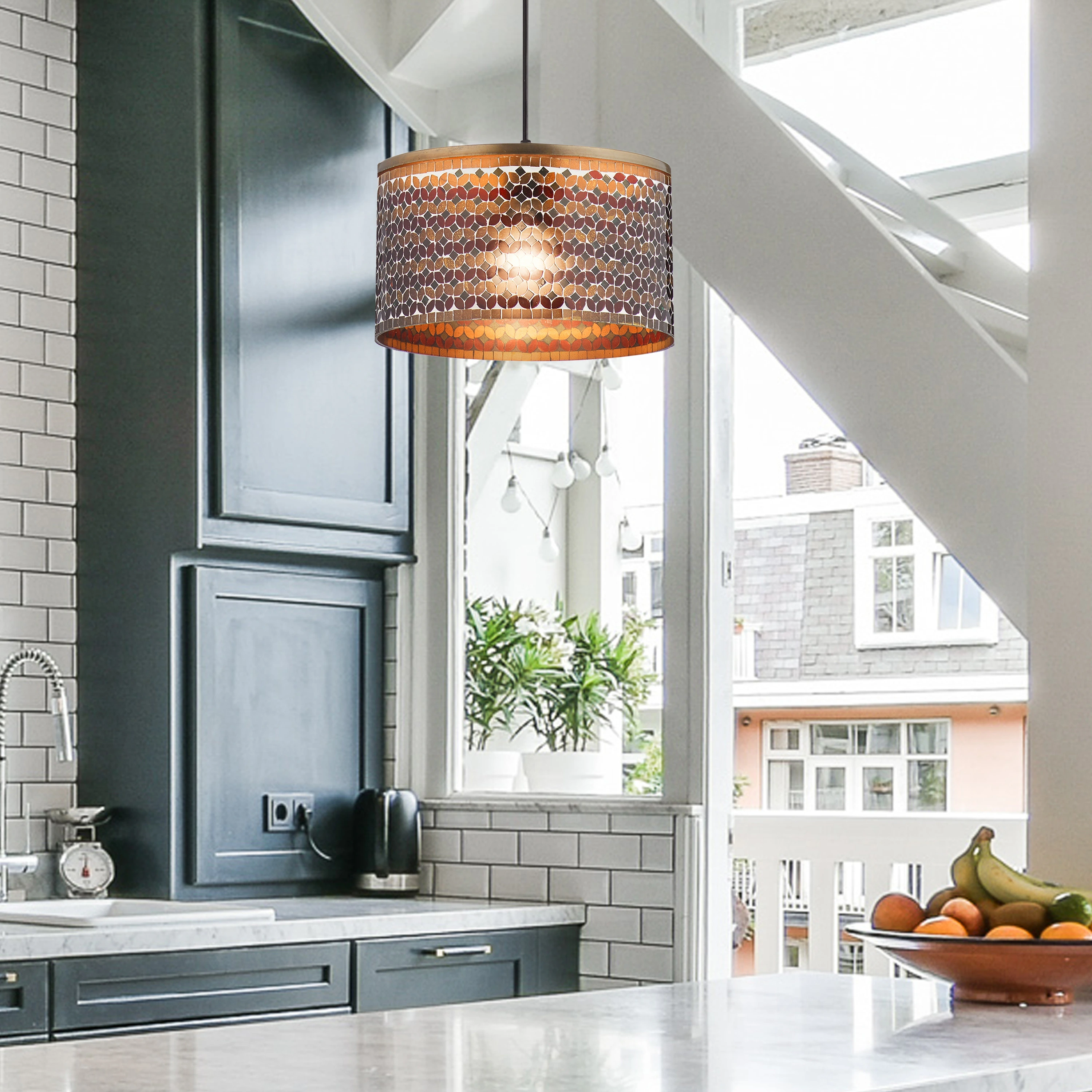Veronica River of Goods Brushed Brass Drum Pendant Light with Gold and Red Glass Shade