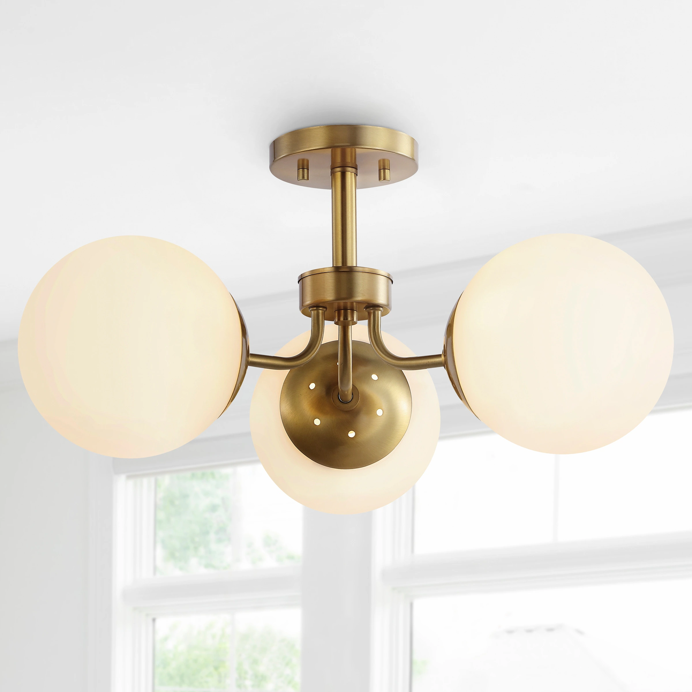 Ojai 23.5" 3-Light Bohemian Farmhouse Iron/Frosted Glass LED Semi Flush Mount, Brass Gold/White by JONATHAN Y