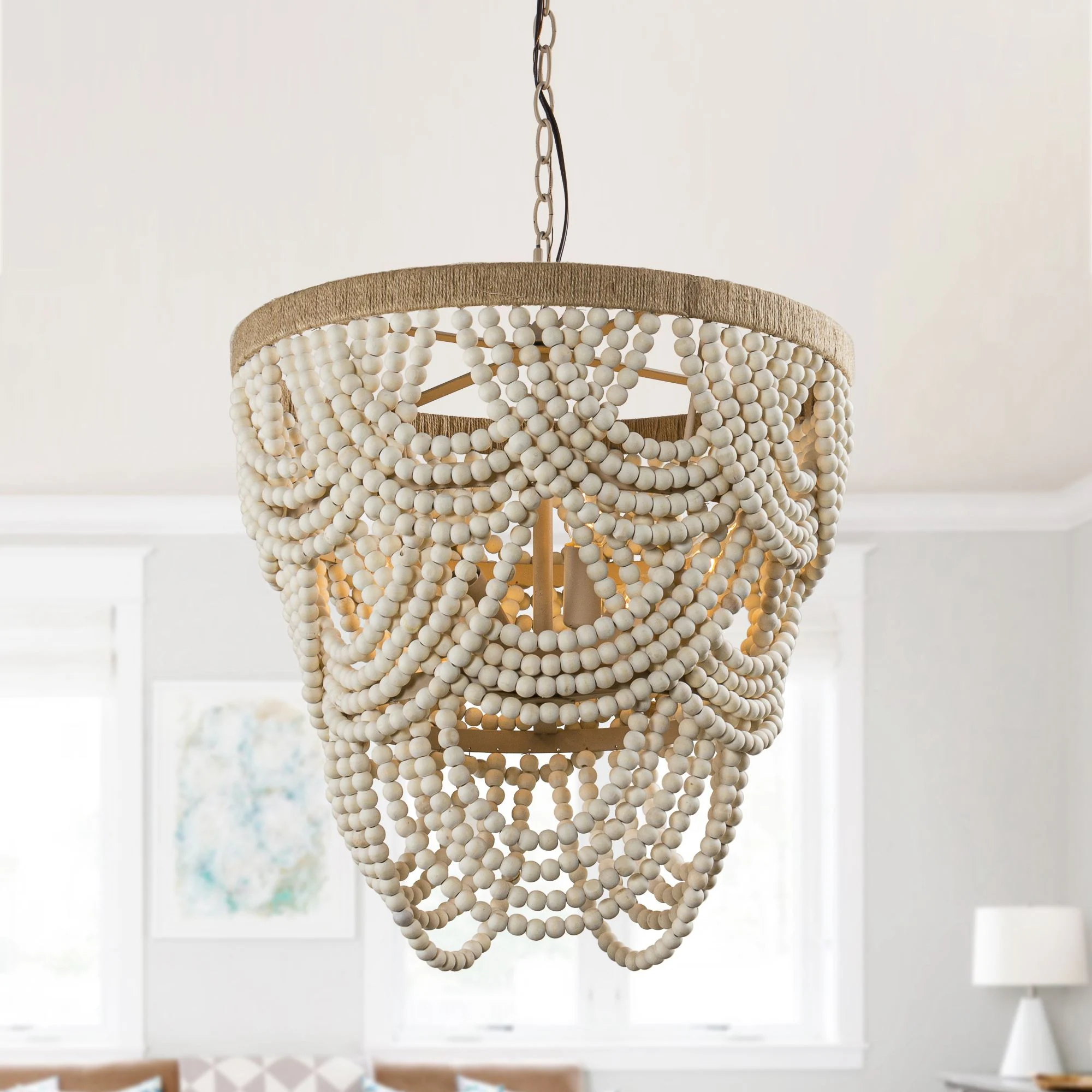 Farmhouse Beige Layered Wood Beaded 4-Light Chandelier