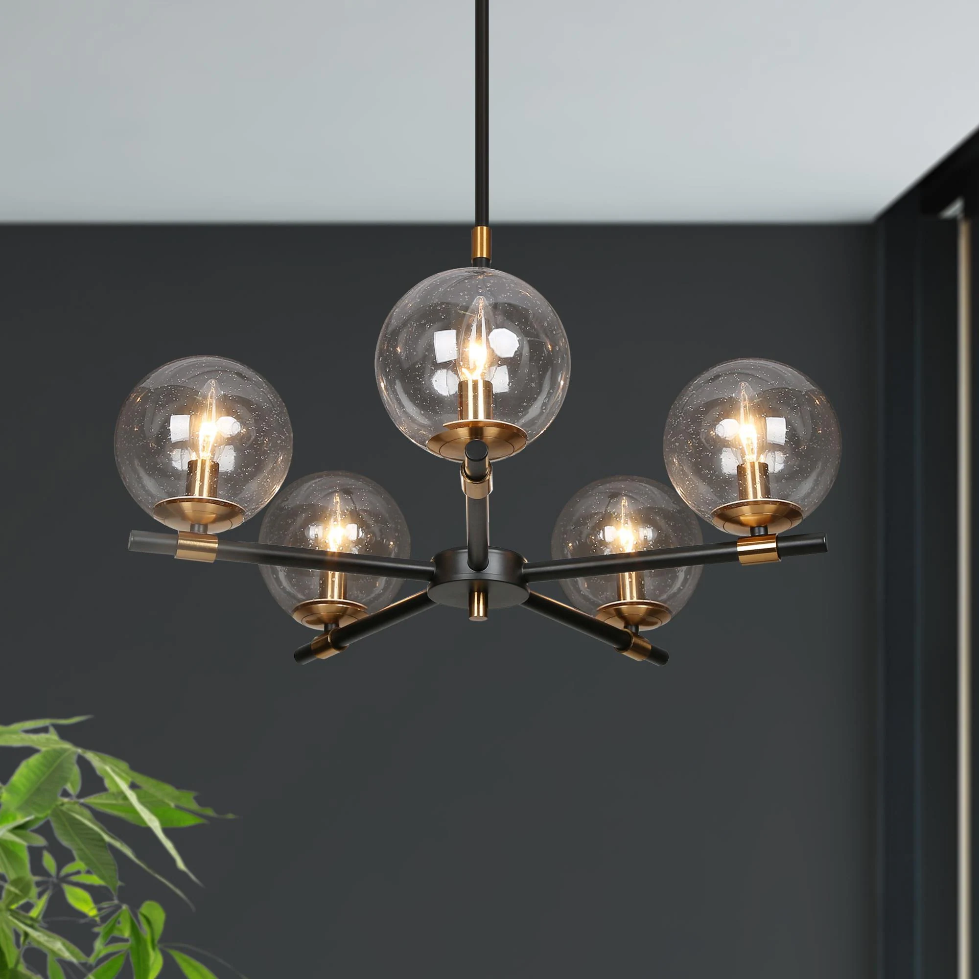 Modern 5-Light Black Gold Wheel Chandelier Globe Glass Pendant Lights for Dining Room